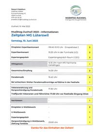 Bei der MG Lüterswil ist es Tradition, dass Mann und Frau am Musiktag teilnimmt. Natürlich sind die Umstände momentan nicht gerade die Günstigsten - wir sind Stand heute (22.04.2023) noch ohne fixen Dirigenten. Aber der von uns sehr geschätzte Dirigent der MG Wengi - Beni Wüthrich - springt auch diesmal wieder in die Bresche und wird mit uns zusammen "Odilia" am Musiktag vor den Experten zum Besten geben. Auf die Marschmusik wird jedoch heuer verzichtet (Festführer hin oder her ;-))